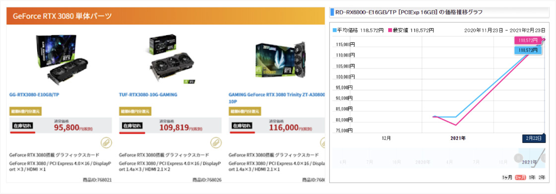 ・グラフィックボードの品薄状態が続き、価格が高騰している。 ・マイニング用として高性能な機器については、日本国内では購入は不可能な状態となっている。