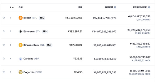 順位 仮想通貨 時価総額 1 ビットコイン 123.6兆円 2 イーサリアム 25.5兆円 3 バイナンスコイン 6.0兆円 4 テザー 4.6兆円 5 カルダン 4.3兆円 総時価総額 213.7兆円 2021年4月2日時点で、暗号資産(仮想通貨)の時価総額の合計は約213.7兆円である。このうち時価総額が最も大きい、つまり最も多く保有されている暗号資産は、ビットコインであり、時価総額は、約123.6兆円(1.13兆ドル)である。仮想通貨全体のおよそ58%を占めている。 暗号資産(仮想通貨)市場は、2025年までに約550兆円(約5兆ドル)規模になると、米デジタル資産金融会社は予測している。