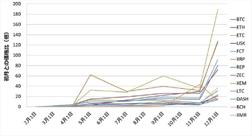 仮想通貨13銘柄の成長率