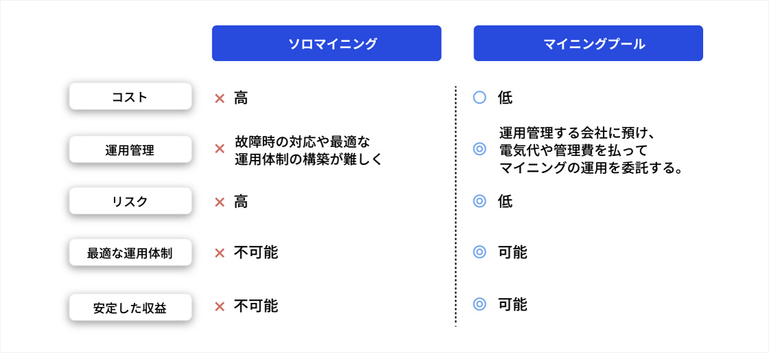 ソロマイニング クラウドマイニング マイニングプール 概要 個人で行うマイニング。 マシン購入から運用管理まで自分で行うのでリスクが高い。 マイニングを行なっている会社に投資をして投資額に応じてマイニング収益を得られる。 グループで行うマイニング(現在の主流) 購入したマイニングマシンを運用管理する会社に預け、電気代や管理費を払ってマイニングを運用してもらう。 メリット 手数料が不要で、分配ではなく総取りの為大きな収入を得られる可能性がある。 マイニングマシンや電気代などの初期費用が不要で 簡単に始められる。 専門家が管理する為、マイニングの知識が不要。マイニングの成功確率が高い。 デメリット 現在、個人レベルのマイニングマシンの性能では企業に負けてしまう為、収益は全く出ない。 手数料を取られる為、収益性が低い。 マイニングマシンを購入する必要がある。 収益性 △ ◯ ◎ 主な報酬の支払い手段