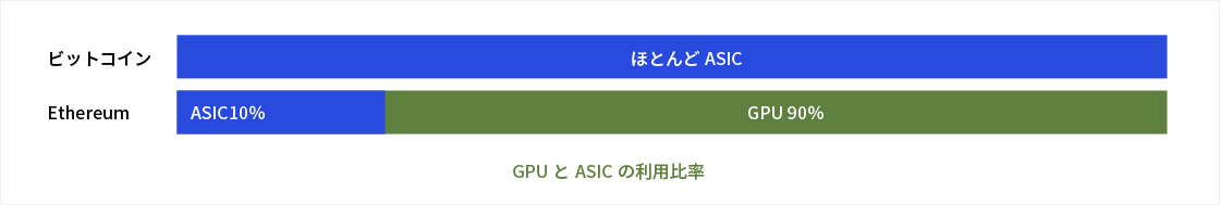 強力なASICマシンは、ブロックチェーンネットワークの分散化を阻害し、セキュリティの低下を招く恐れがあると言った懸念により、 EthereumはASIC耐性を持つ通貨である。 (ASIC耐性の内容) Ethereumのネットワークは現在、コンセンサスアルゴリズムにPoW方式の「Ethash」(イーサハッシュ)を採用し、巨大な有効非巡回グラフ(DAG)構造を取るため、従来のアルゴリズムに比べてメモリ使用量が格段に大きい一方で、CPUの計算処理にかかる負荷が小さいという特長を持つ。そのため、一般に計算が複雑であるほど優位性が大きくなるASIC(エーシック)には不向きな仕組みとなっている。