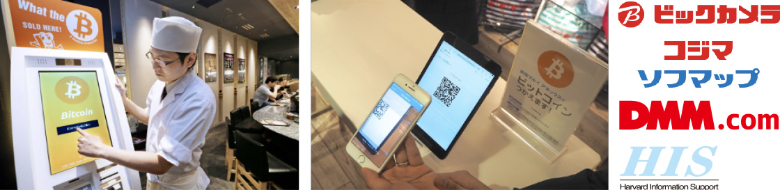 家電量販店のビックカメラ、コジマ、ソフマップは観光客の利用を見込み、一部の店舗でビットコインでの支払いを可能にしている。DMM.comではビットコインでDMMポイントを購入・チャージすることで電子書籍やゲーム、CD/DVDなどDMMの商品を購入することができる。