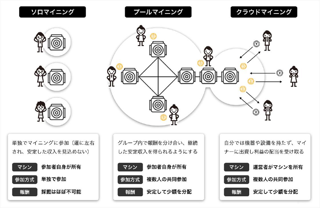 ソロマイニング クラウドマイニング マイニングプール 概要 個人で行うマイニング。 マシン購入から運用管理まで自分で行うのでリスクが高い。 マイニングを行なっている会社に投資をして投資額に応じてマイニング収益を得られる。 グループで行うマイニング(現在の主流) 購入したマイニングマシンを運用管理する会社に預け、電気代や管理費を払ってマイニングを運用してもらう。 メリット 手数料が不要で、分配ではなく総取りの為大きな収入を得られる可能性がある。 マイニングマシンや電気代などの初期費用が不要で 簡単に始められる。 専門家が管理する為、マイニングの知識が不要。マイニングの成功確率が高い。 デメリット 現在、個人レベルのマイニングマシンの性能では企業に負けてしまう為、収益は全く出ない。 手数料を取られる為、収益性が低い。 マイニングマシンを購入する必要がある。 収益性 △ ◯ ◎ 主な報酬の支払い手段