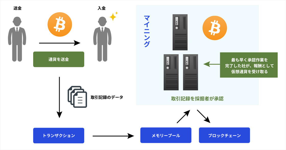 ビットコインをはじめとする暗号資産には、日本円や米ドルのように通貨を管理する国や中央銀行が存在せず、第三者がコンピュータのネットワークを利用して暗号資産を管理する仕組みとなっている。 この第三者による取引の承認および確認作業がマイニング(採掘)である。コンピュータで取引をチェックし、ブロックチェーンと呼ばれる取引台帳に追記していくには、膨大な計算作業が必要となる。