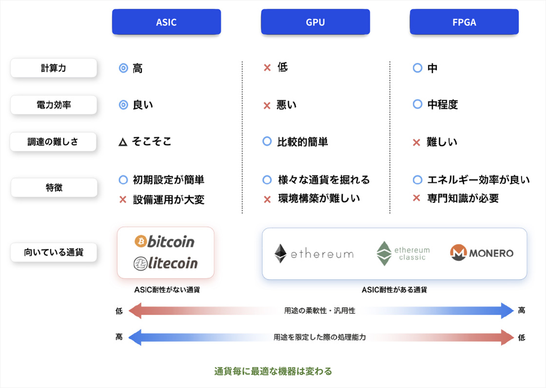 通貨毎に最適なマシンは異なる。ビットコインを採掘したい場合は、ASIC(エイシック)でなければほとんど報酬を受け取ることができない。反対に、ASICでは採掘できない通貨の場合はGPU(ジーピーユー)やFPGA(エフピージーエー)を選ぶ必要がある。 高性能なASICマイニングの運用において、効率良く熱を逃がせるようなエアフローを構築したり、省スペースで配置するためには一定のノウハウが要求される。
